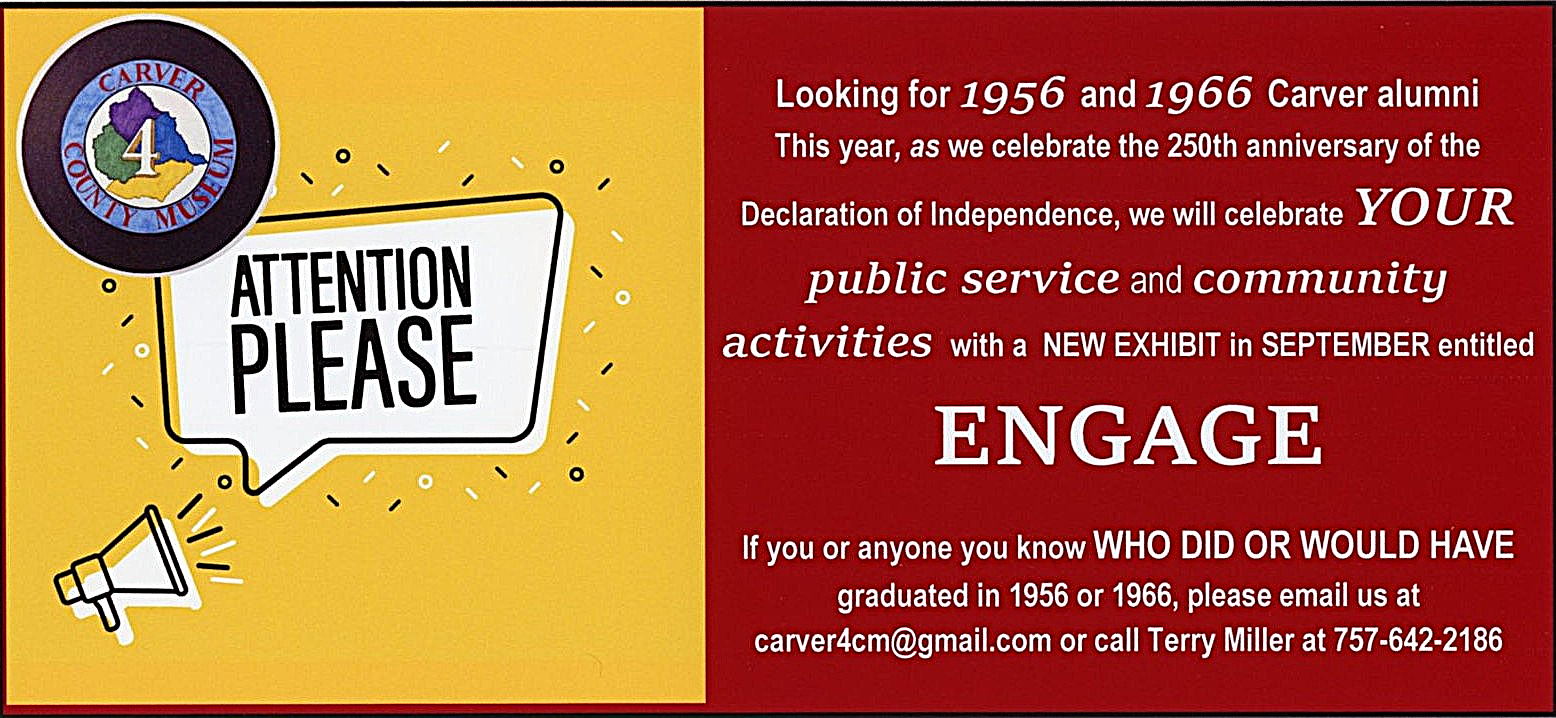Tying into a theme of active civic engagement, in the fall we will present an exhibit that features members of Carver's graduating classes of 1956 and 1966, asking the question, "How did you engage in your community and its progress in your post-Carver years?"