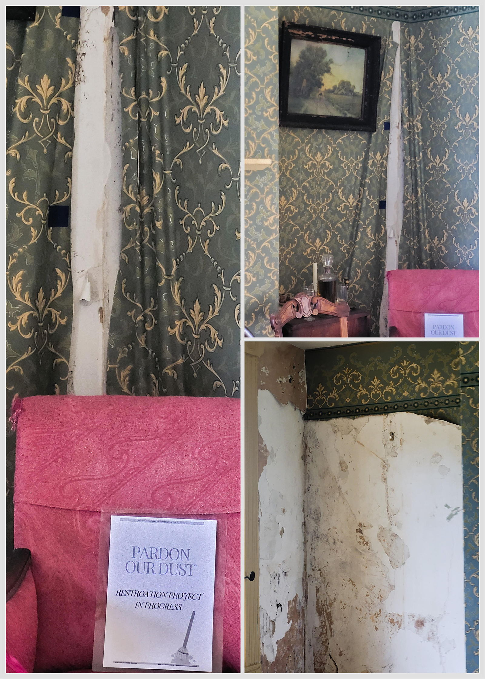 (Water damage has caused a large portion of the wallpaper to deteriorate.)